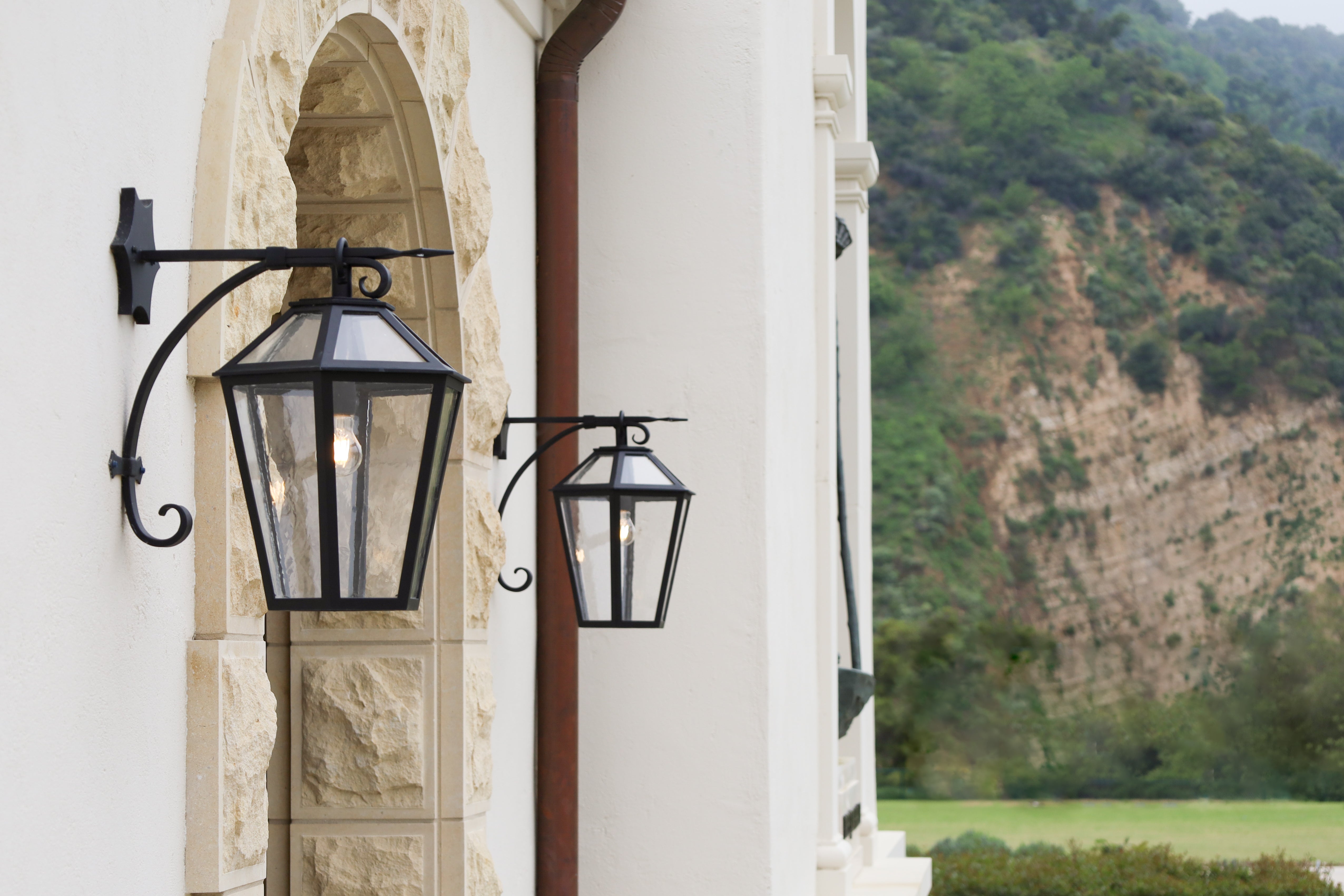 The St. Anthony was created by Anthony Grumbine of Harrison Design for a Mediterranean residence on which we collaborated. The gracefully curved arm and starred backplate detail create dynamic silhouettes from every angle with our SBLC Antique glass. Handmade with heavy gauge steel.